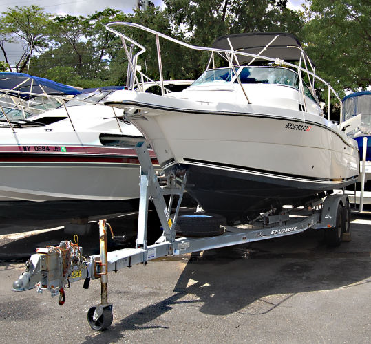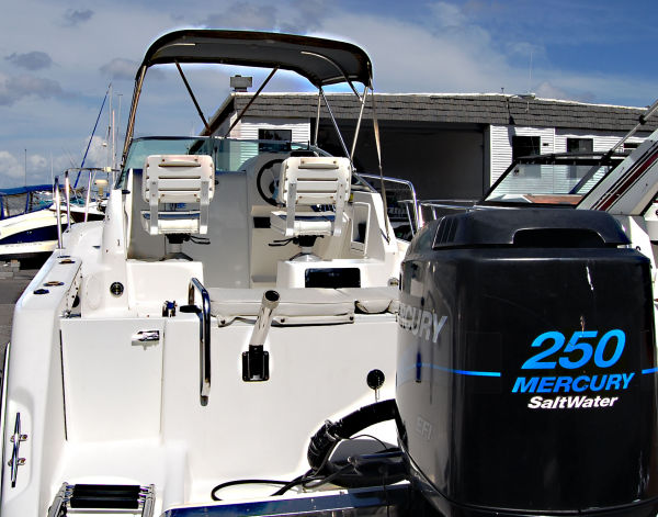 Her features include: Mercury 250 HP EFI Saltwater Series Outboard with very low engine hours, Stainless Steel Prop, Hydraulic Steering,Danforth Compass, Garmin 545S GPS/Chart Plotter/Fish Finder/Digital Depth Finder, Dual Battery System, Trim Tabs, Flush Mount Rod Holders, Integral Swim Platform w/Drop Ladder, Circulating Livewell, Raw Water Washdown, Insulated Fish/Ice Boxes, 2 Transom Doors, Bow Pulpit w/Anchor Roller, Twin Pedestal Captain’s Seats, Welded Stainless Steel Bow Rail, Bimini Top. ALSO INCLUDED is a 2002 EZ Loader Galvanized Tandem Axle Roller Trailer w/Brakes, Spare Tire, Tongue Jack, Bearing Buddies & Waterproof Submergible Lights. Meets all BoatMax quality standards criteria. GREAT FISHING BOAT AT A GREAT PRICE!!!